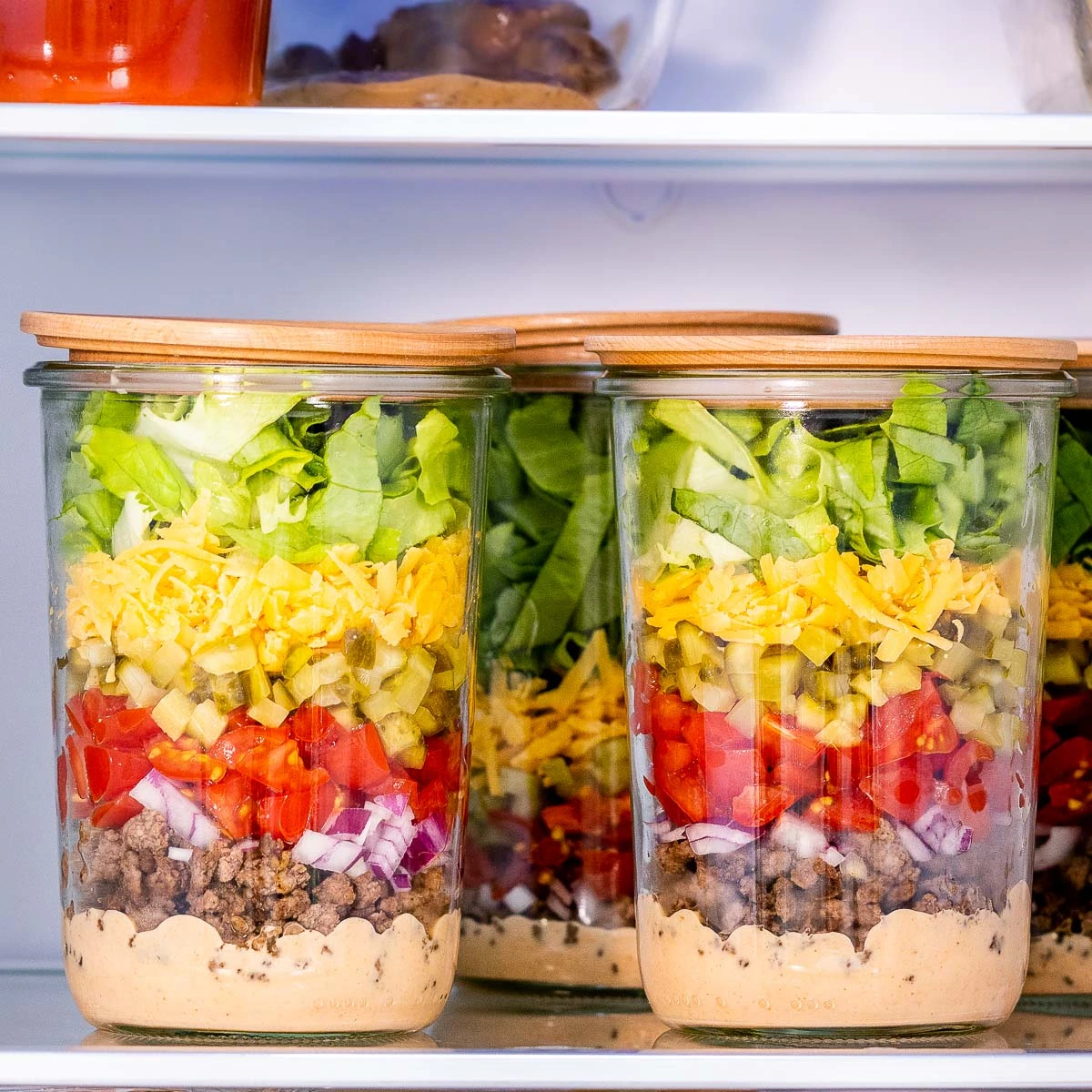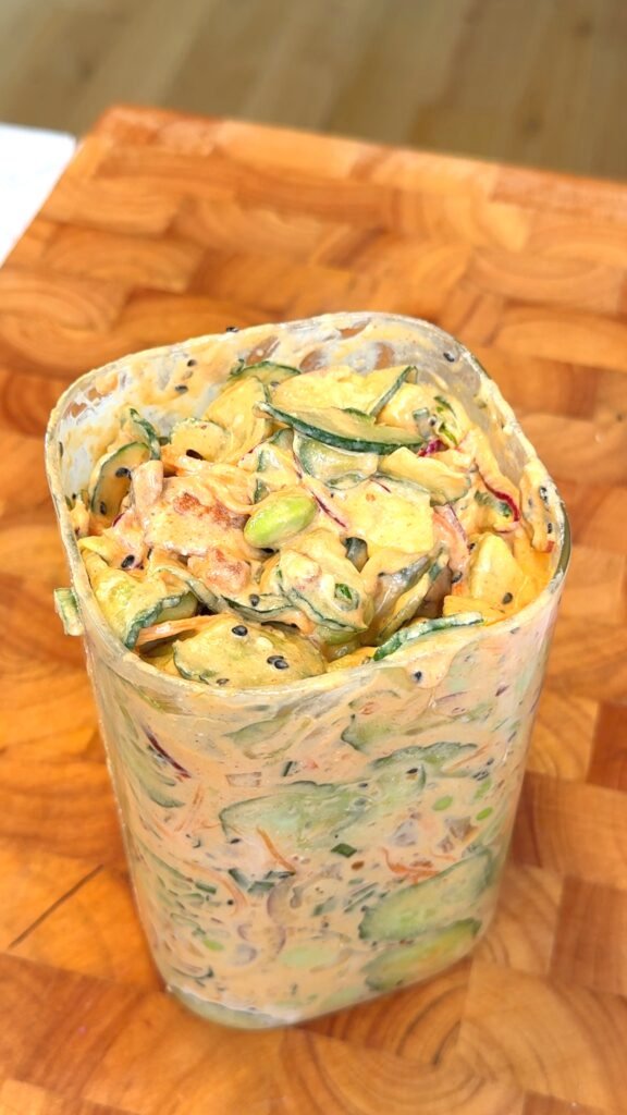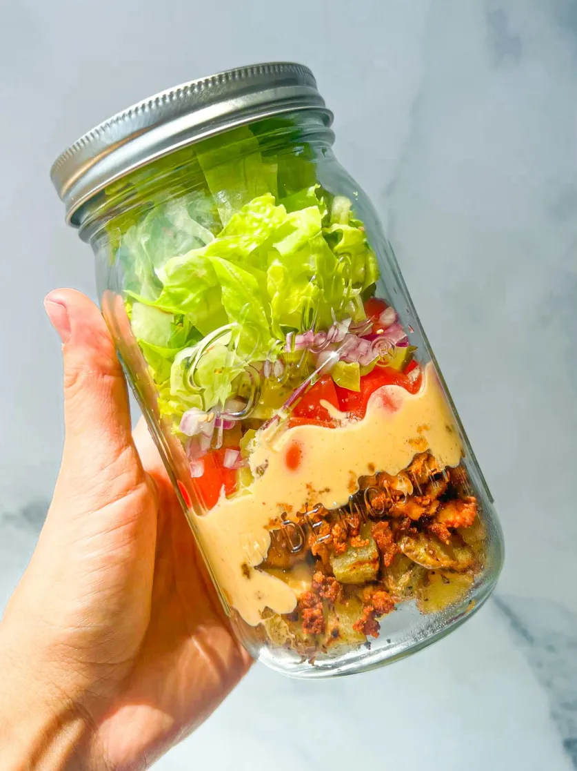 Quando montada corretamente seguindo o método das camadas que eu ensino, a salada dura de 5 a 7 dias fresquinha na geladeira. Isso significa que você prepara tudo no domingo e tem almoço ou jantar saudável pronto a semana toda. Zero desperdício, zero trabalho diário.
